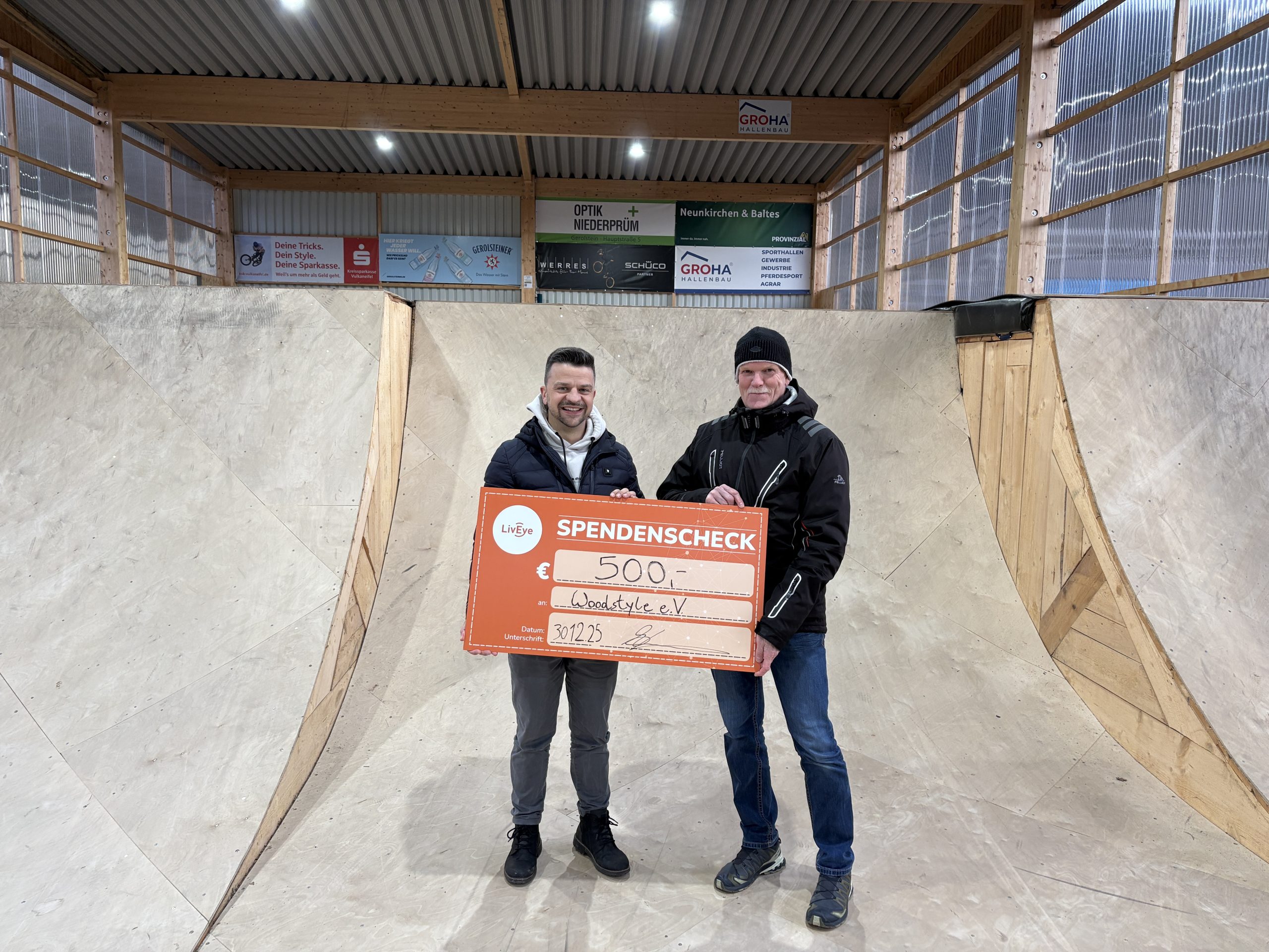 Im Dezember übergab Markus Diederichs, Geschäftsführer der LivEye GmbH, einen Spendenscheck in Höhe von 500 € an den BMX-Verein Woodstyle e.V. in Birresborn. Entgegengenommen wurde die Spende von Guido Clemens, Vorstand des Vereins. Woodstyle e.V. wurde ursprünglich aus einer Elterninitiative heraus gegründet, um Kindern und Jugendlichen in der Region den Zugang zum BMX-Sport zu ermöglichen. Inzwischen hat sich daraus ein leistungsstarker Verein entwickelt, in dem einige der trainierenden Kids bereits auf sehr hohem sportlichem Niveau unterwegs sind.